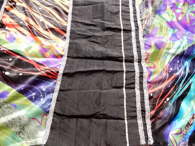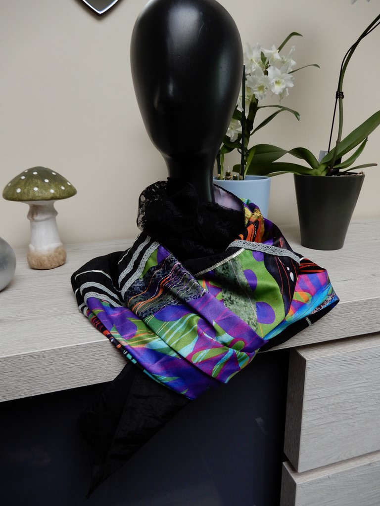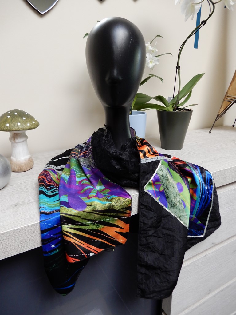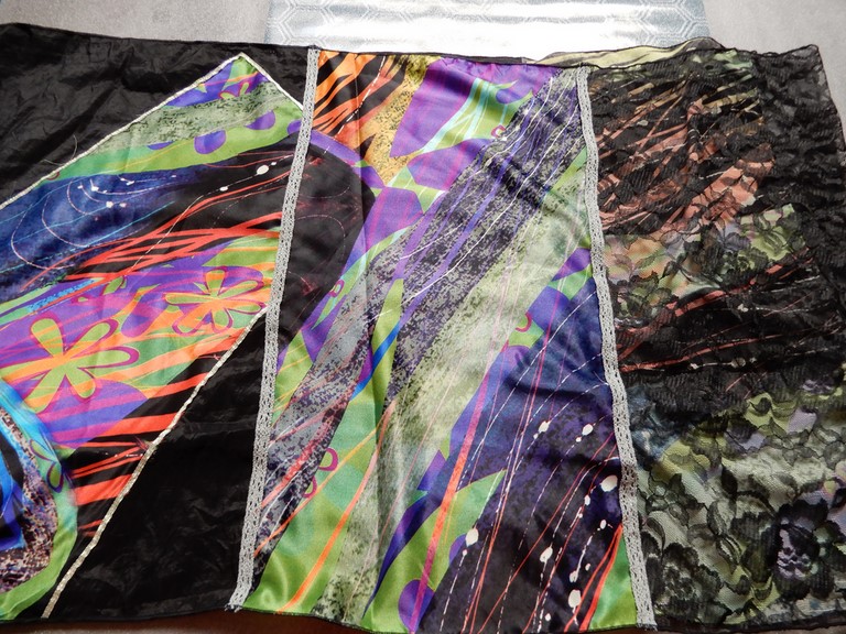 Echarpe en assortiment de tissus en satin, soie sauvage et dentelle