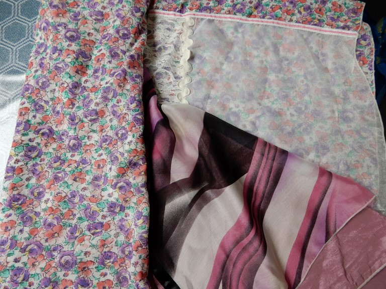Très grand foulard, mélange de voile imprimé, dentelle et soie sauvage